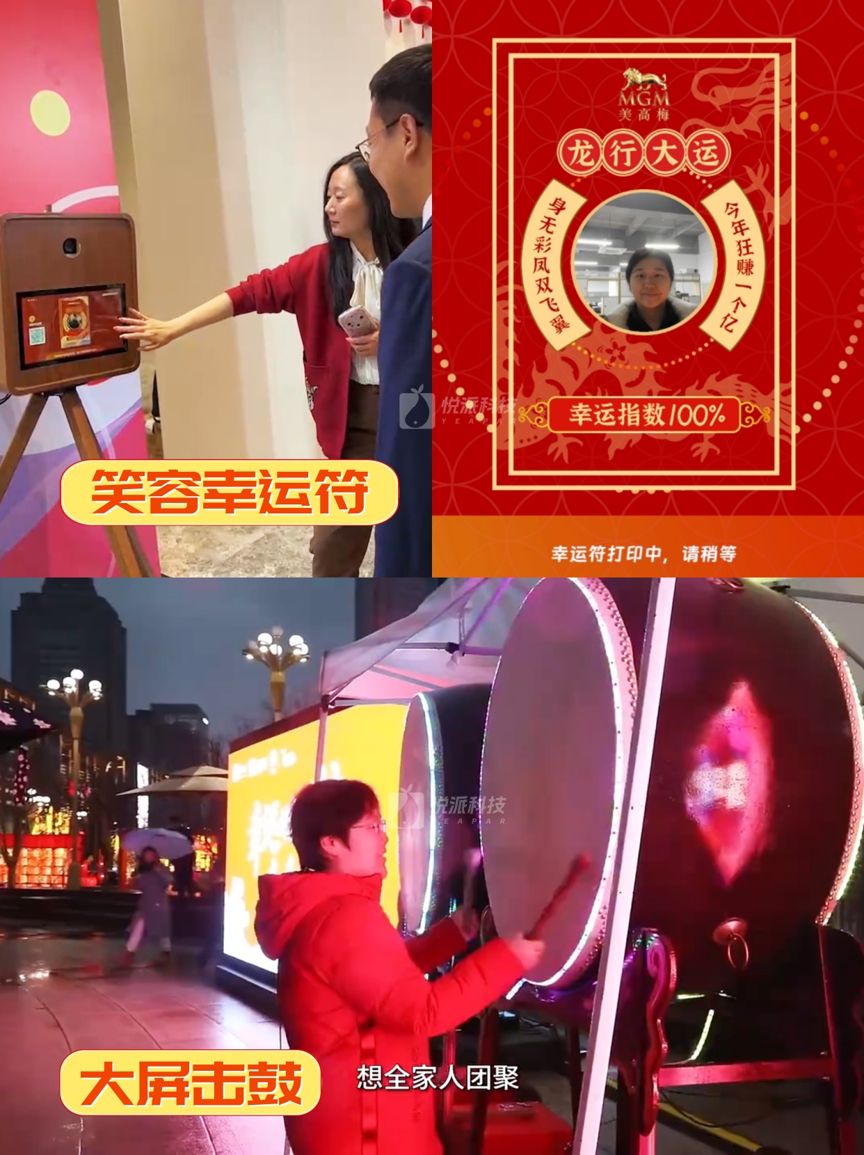 将传统击鼓与现代视觉结合。击打的仪式感能迅速点燃现场气氛,而大屏同步触发的震撼画面,则将个人动作升华为集体视觉盛宴,让品牌祝福在声光交织中深入人心,营造热烈的新年氛围。