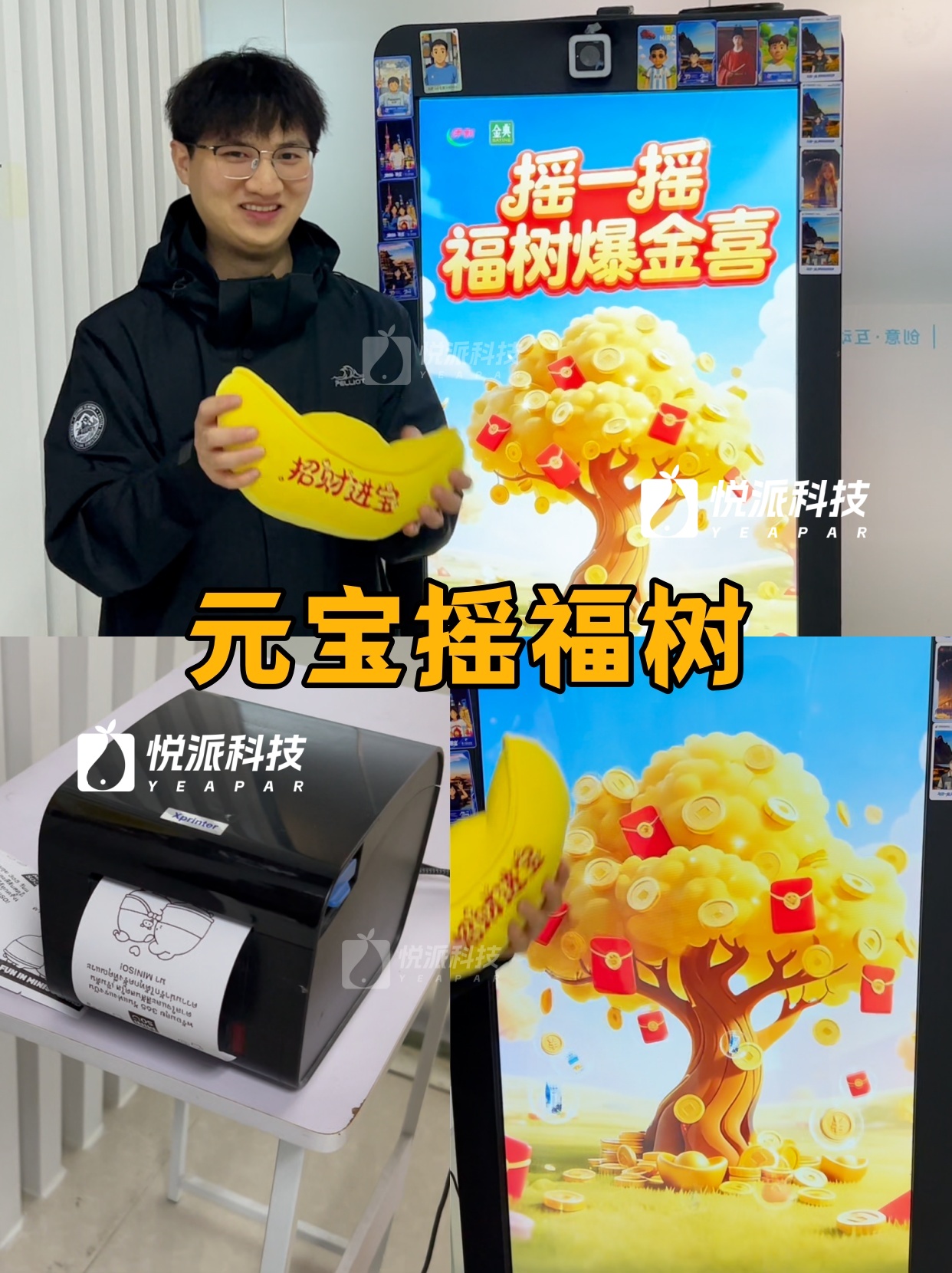 参与者通过手动摇晃实体元宝道具,驱动大屏上的摇钱树掉落福字、品牌定制道具等虚拟元素,完成互动最终生成一张实体权益小票。此装置将传统祈福行为与数字视觉、实物奖励强关联,以直观有趣的肢体交互吸引人流,在营造浓厚年节氛围的同时,高效传递品牌信息或商业权益,实现品效合一的活动目标。