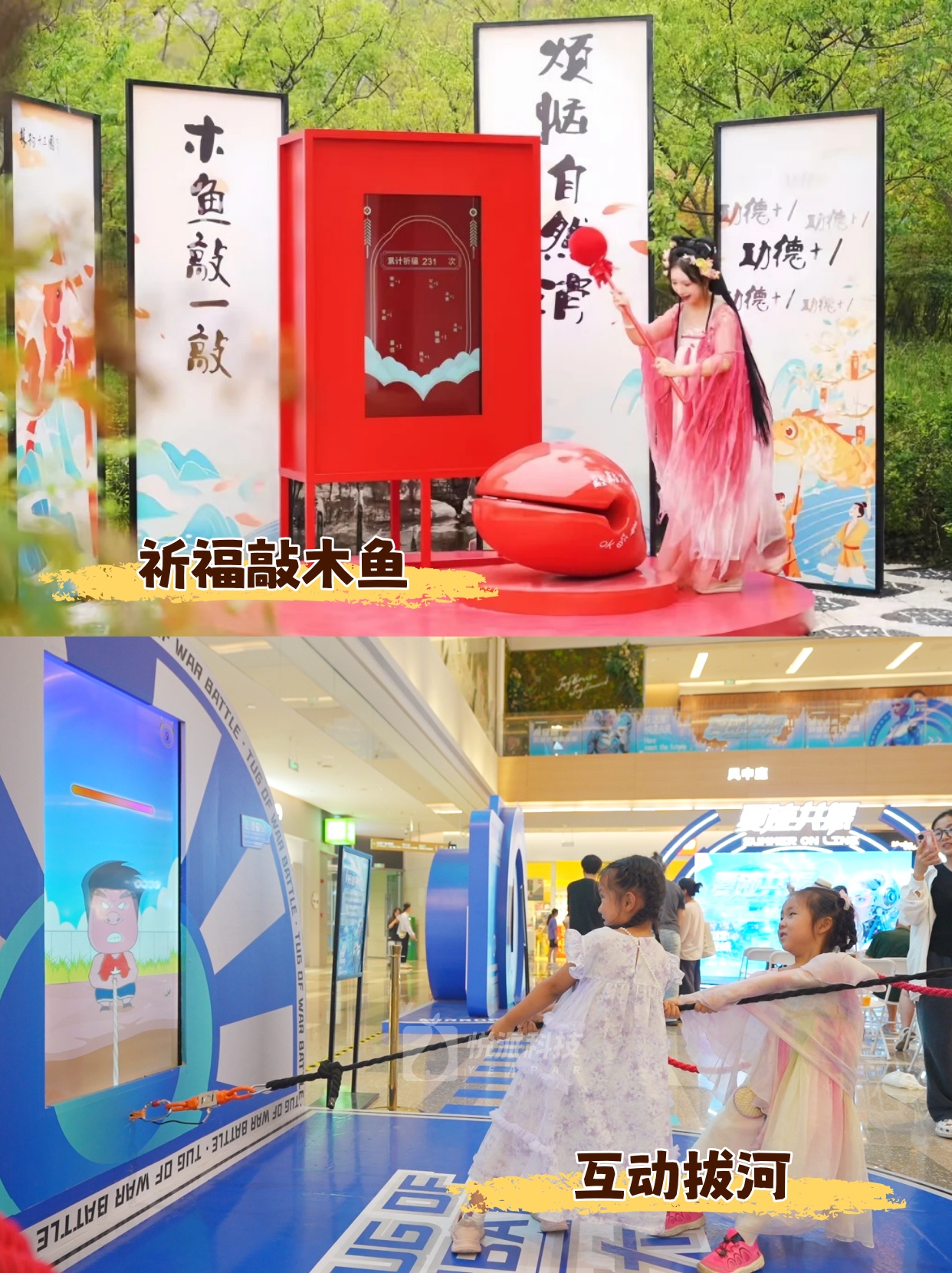 敲击实体木鱼触发大屏互动,实时弹出定制吉祥话与祝福照片,视听双效营造沉浸式祈福体验。以科技赋能传统仪式,用趣味交互自然引发打卡传播,为活动注入情感温度与文化记忆点。