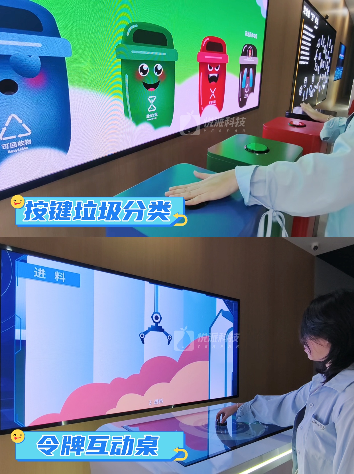 参与者通过脚踩踏板控制屏幕,将随机掉落的虚拟垃圾准确投入对应分类桶,用操作让分类过程充满动感,以游戏化方式强化垃圾分类记忆,降低教育说教感,同时用身体参与提升现场互动热度与停留时长。