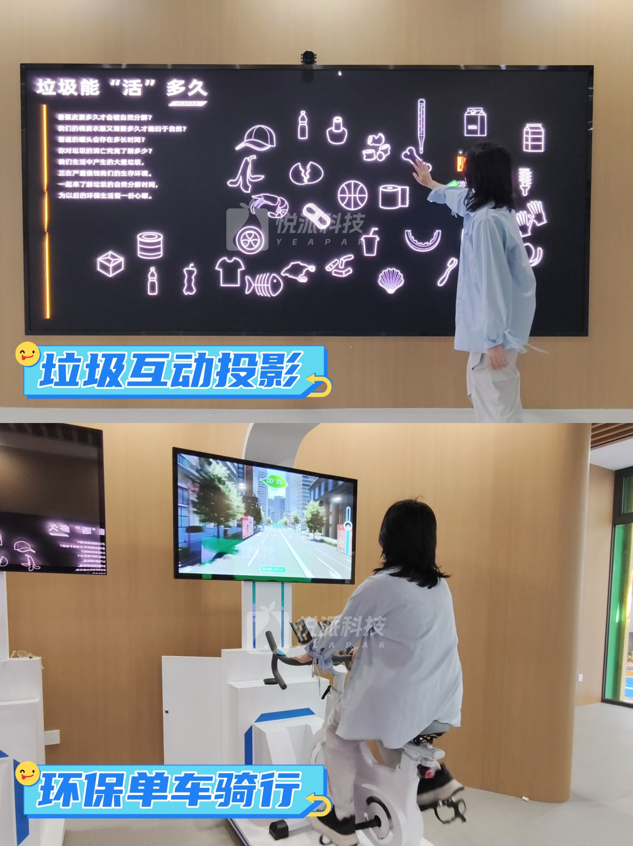 参与者触碰投影墙面上的不同垃圾图标,画面随即动态展示垃圾能活多久,用可视化方式呈现时间差异,将抽象的知识转化为直观的互动体验,让“塑料百年不烂”的认知在触摸中留下深刻印象,实现真正的沉浸式环保科普。