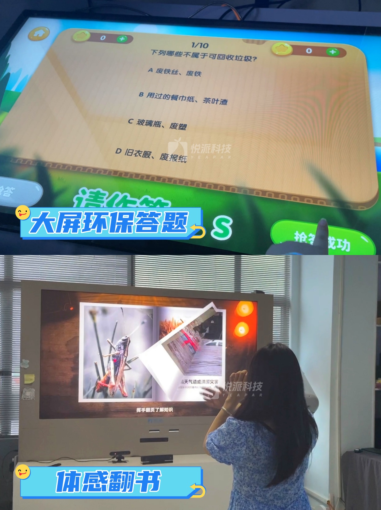 参与者站在屏幕前挥动手臂,通过体感技术控制大屏书页前后翻动,每翻一页呈现不同的环保知识或行动倡议。将阅读行为转化为无需接触的体感互动,用翻页的仪式感串联环保内容叙事,既降低操作门槛,又让知识传递在自然的肢体动作中悄然完成,成为兼具科技感与教育性的沉浸体验装置。